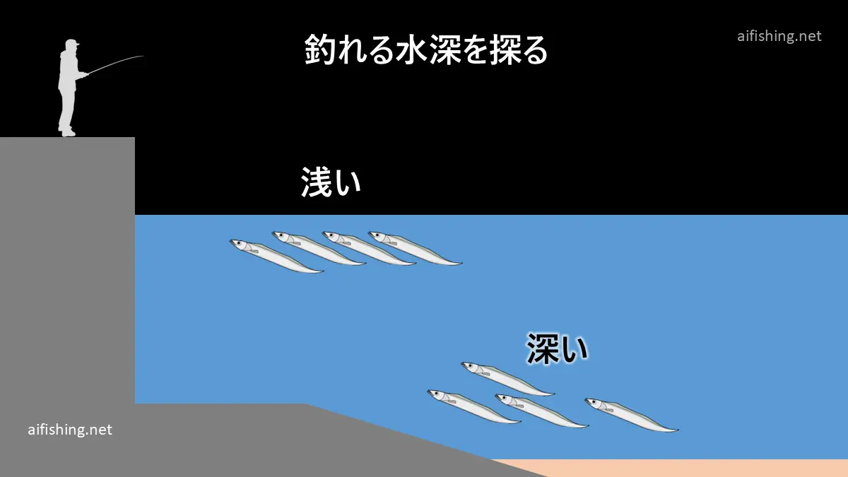 ・明るいうちや寒い場合は深い場所で釣れることがあります。