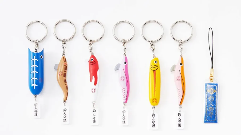「釣人守」のバリエーションはたくさんある。「釣人ルアー守」という、ルアーやエギのキーホルダータイプやミニ御札タイプの「釣人守」がある。